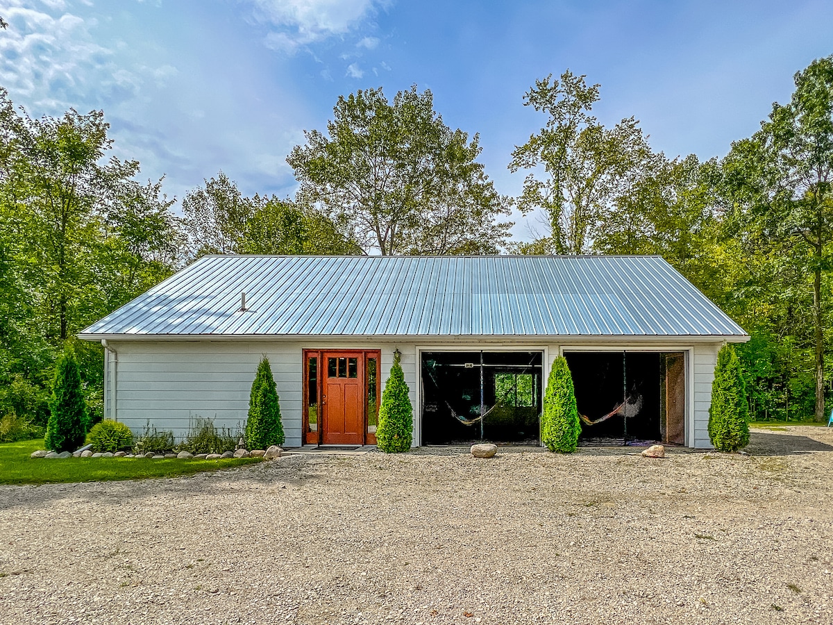 ボーホー/インダストリアルなロマンチックな休暇 - 2階建て、6エーカーの森林。 屋内ハンモック&外に開くガレージスクリーン付きドア2つ(季節限定)2階にクイーンベッドと布団2台を備えたオープンプランの寝室。屋外のファイヤーピット、ホットタブ、自転車2台。 ヴィンテージ1973年トリリウムキャンピングカー@追加料金50ドル/日、キャビンレンタルのみ。 アンティーク、レストラン、マウント・ホーリー・スキーリゾート、パインノブ・コンサート&スキー/スノーボード・リゾート、結婚式会場、ヘザーハイランド・ゴルフ&ホーリーオークス・パークまですべて数分です。エンジェルウィングスの写真撮影用壁画。