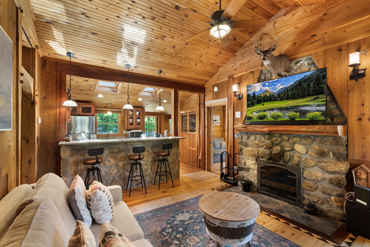 この物件は、グリーンウッド湖とその向こうにある山々の比類ない景色を誇っています。 私たちの専用庭園には、季節に応じて流れる滝があり、魚やカエルがいるユリの池に流れ込みます。 日陰のあるパティオからは、パノラマビューとガスグリルを楽しめます。 冬季は、近くのゲレンデでスキーをした後、猫足のバスタブでくつろぐか、リビングルームの居心地の良い雰囲気の中で過ごしてください。リビングルームには、むき出しの木製天井、暖かい暖炉、スマートテレビ、レコードプレーヤー、ボードゲームが備わっています。