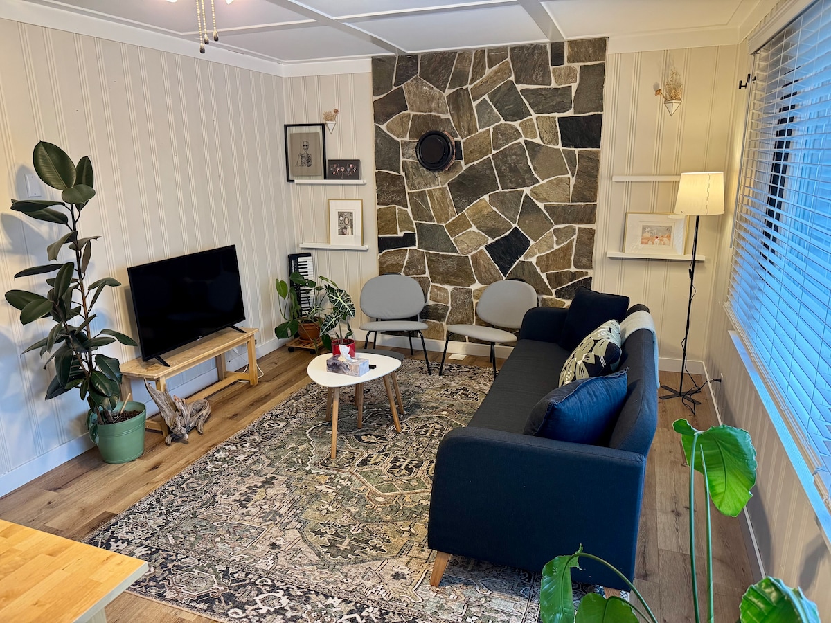 Surround yourself with style in this standout little space. This tiny home boasts about 400 square feet of pure comfort and fabulosity! Well appointed with enviable finishes and designer touches, this little gem will not disappoint! The bathroom is adorned with a vintage claw foot tub with shower and beautiful Kohler pedestal sink. A wonderful little eating counter that can easily double as a work space and a large, comfy sofa/chaise will embrace you after a day of meetings or family visits.