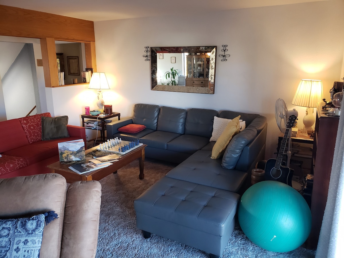 Forget your worries in this spacious and serene space. Your private room is set up with a memory foam bed and a desk with a leather chair. There is cubby hole storage as well as a rack for hanging clothing. In the hallway is a full bathroom, possibly shared with other guests but not the host. Additional bathroom is downstairs. Relax in the lounge area with a television and a fireplace or go outside to the patio to eat or enjoy a view of the mountains. Basic breakfast snacks provided.