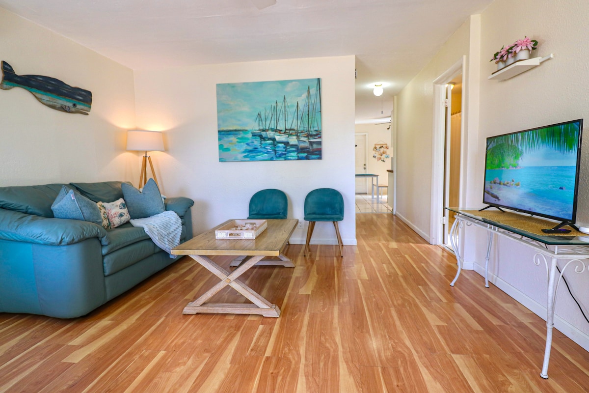 ビーチまで車でわずか10分で、豪華な快適さとモダンなスタイルを体験してください。 ユニークなカスタムキッチンカウンタートップと2つの居心地の良いベッドが気に入るはずです。 ご滞在を快適にするために、65インチ4 Kスマートテレビ、洗濯機・乾燥機、専用駐車場2台分、専用パティオ、設備の整ったキッチンを完備しています。 専用のワークデスクと高速インターネットがあります。 バスルームにはハイドロジェットシャワーシステムと照明付きミラー、色が変わるムード設定ミラー、インパクトウィンドウ、セントラル空調、正午チェックアウト。