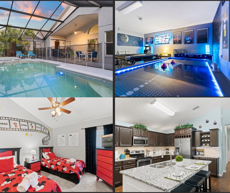 The perfect balance of STYLISH DESIGN, LUXURIOUS COMFORT, & ENDLESS ENTERTAINMENT, beautifully situated with stunning views in the sprawling 3.5 square mile Reunion Resort. You will have your own private pool, spillover spa, STAR WARS cinema-game room with pinball, classic arcade games, and karaoke, MARVEL kids room with tube slide and double bunks, the latest Xbox Series S, a sprawling 2000 ft2 pool deck, fire pit, and even a HARRY POTTER cupboard hidden under the stairs, minutes to Disney.