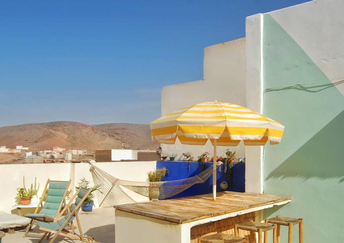 Mirage House Mirleft Nous serons ravis de vous accueillir à Mirage House une maison simple et chaleureuse au cœur de Mirleft ici vous trouverez le calme la lumière et tout le confort pour profiter pleinement de votre séjour que ce soit pour quelques jours ou plusieurs semaines La maison est décorée dans un style marocain Berbère authentiques avec des espaces aérés et une ambiance familiale La terrasse est parfaite pour prendre un thé lire au soleil ou simplement profiter du calme de Mirleft