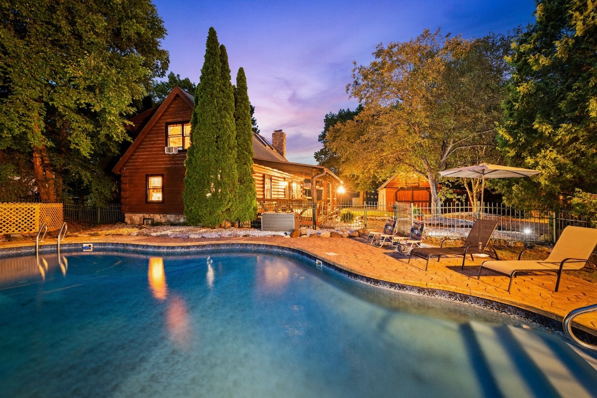川沿いのキャビン•温水プール、ジャグジー、サウナ