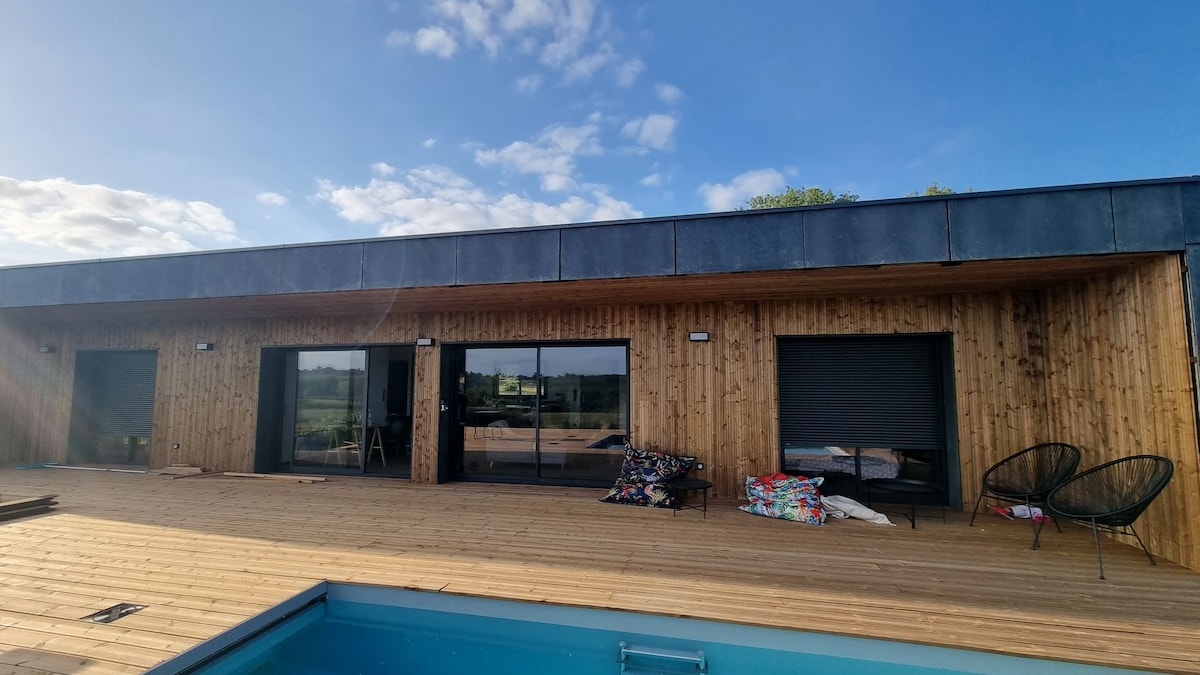 環境に優しい木造平屋🌴の住宅。6000平方メートルの敷地に、テラス、プール、ジャグジーが備えられています。南向きで、ブドウ畑とピレネー山脈の丘陵の景色が見渡せます。 ☀️