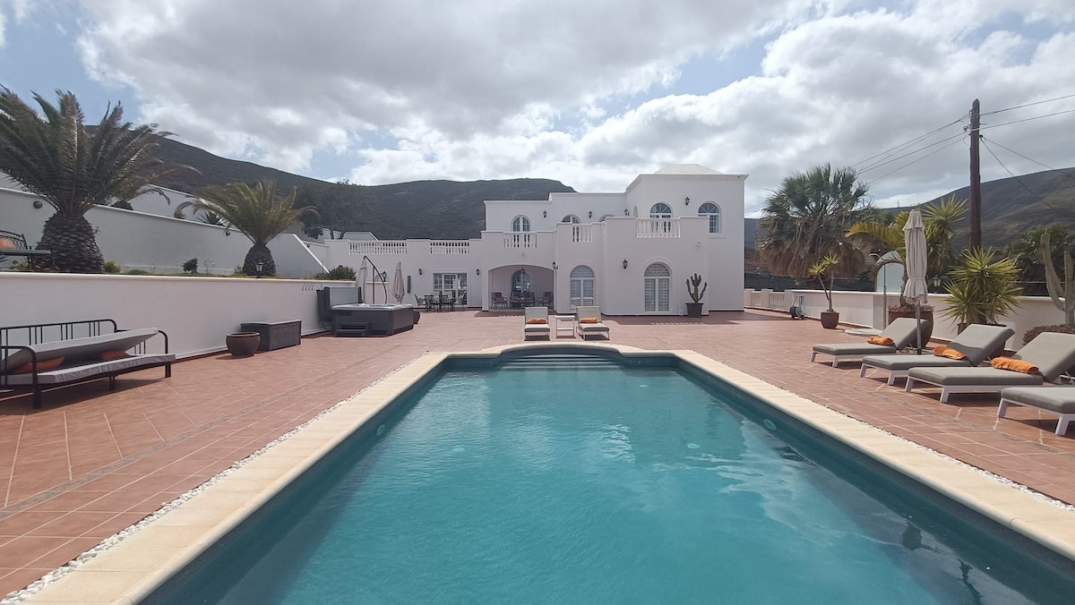 - 最近建てられた豪華でモダンなヴィラで、全5室のベッドルームには専用バスルームがあります。 2000平方メートルの敷地内に建てられており、玄関のすぐそばに駐車場と電気自動車の充電ポイントがあります。 -海、フエルテベントゥラ島、ロス・アハチェス火山の素晴らしいパノラマビュー。 -広いテラスと庭、温水プール(12.5m x 3m)、ジャグジー、ジム、バーベキュー、ファイヤー、ビリヤードテーブル、卓球台。 光ファイバーWi-Fi、ほとんどの言語のチャンネルを含むスマートテレビ2台!
