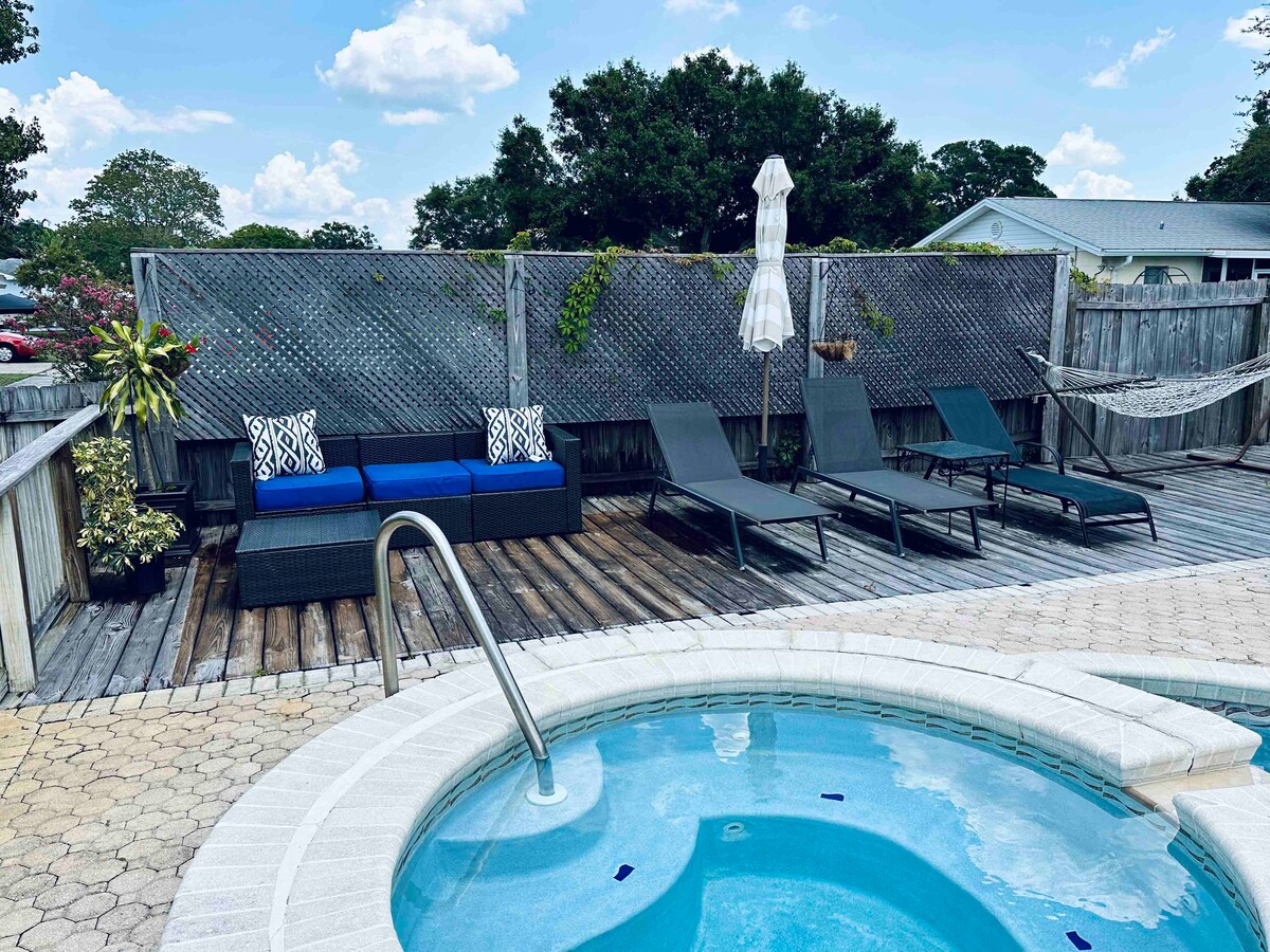 ポップな色、モダンな装飾、無料の温水プール(季節限定、10月15日から4月15日まで、80 ~ 85 度)、ジャグジー、珍しいサウナ、ティキバー、焚き火台、そしてすべてが新しいのがお好きなら、この家はぴったりです!2025年4月に新しいジャグジーが設置されました!!! ショッピングやビーチに非常に近く、完璧な専用バケーションホームです!私たちは家族経営で、ゲストとゲストの休暇体験に専念しています。ご不明な点がございましたら、お気軽にお問い合わせください。超高速WI-FI 753Mbps -(モデムに接続すると1 G)Airbnb認証済み