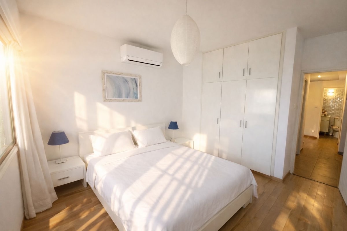3 MIN WALK TO THE BEACH! In the center, 150m from Finikoudes, restaurants, cafes, bars. Bus stop outside, among others for bus 425 coming from the airport. Modern, airy, spacious. New furniture, appliances, kitchen, 43" smart TV, cable channels, unlimited fiber optics internet at 200/20. Shops, restaurants, the market, the sea within 2-10 min walk. You will love it!