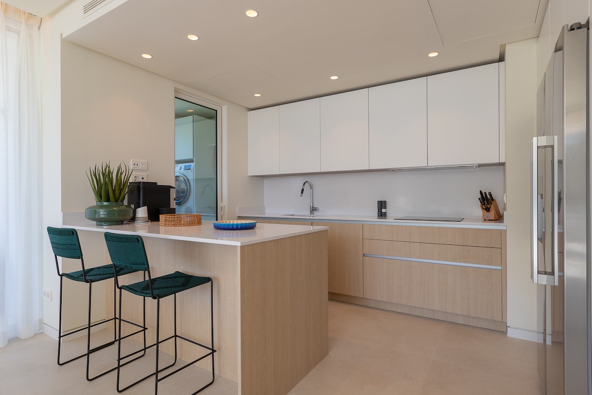 Beautiful premium beachside villa in La Cala de Mijas. Fully renovated with 4 bedrooms and 4 modern bathrooms (2 beds & 3 baths on the ground floor). Wheelchair-friendly with ramp access. Private pool, flat walking paths, and rare private onsite parking for 2–3 cars. Walk to 60+ restaurants and the beach. New A/C in every room, premium bedding, fresh linens, and a fully equipped kitchen — a refined coastal retreat designed for comfort and relaxation.