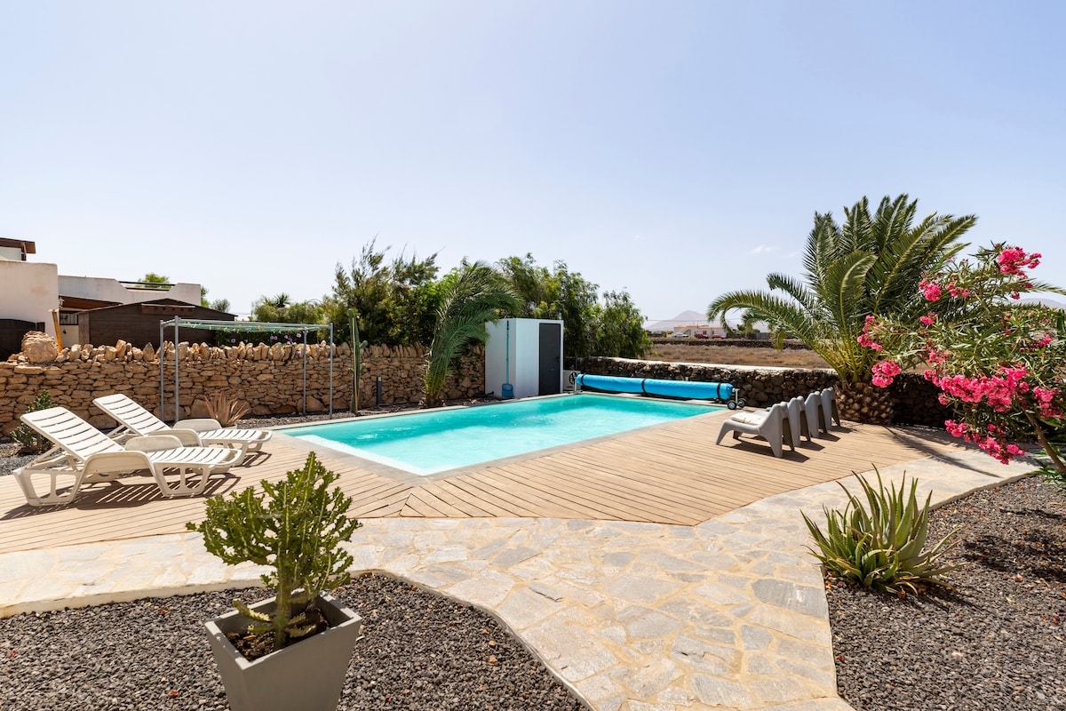カサ・エロイサは、ラ・アソマダに位置し、海とフエルテベントゥラ島とロボス島の素晴らしい景色を望むことができます。バリアフリーの2つのベッドルームとバスルーム、キッチンとリビングルーム、屋内プール(スパではありません)と大きなテラスがあります。屋内プールは24時間10月から4月まで営業しており、室内に収まっています。寝室、キッチン、リビングルーム、プールは、大きな窓と自然光で外に面しています。 1階建てです。独立した建物で、無料の屋外駐車場があります。