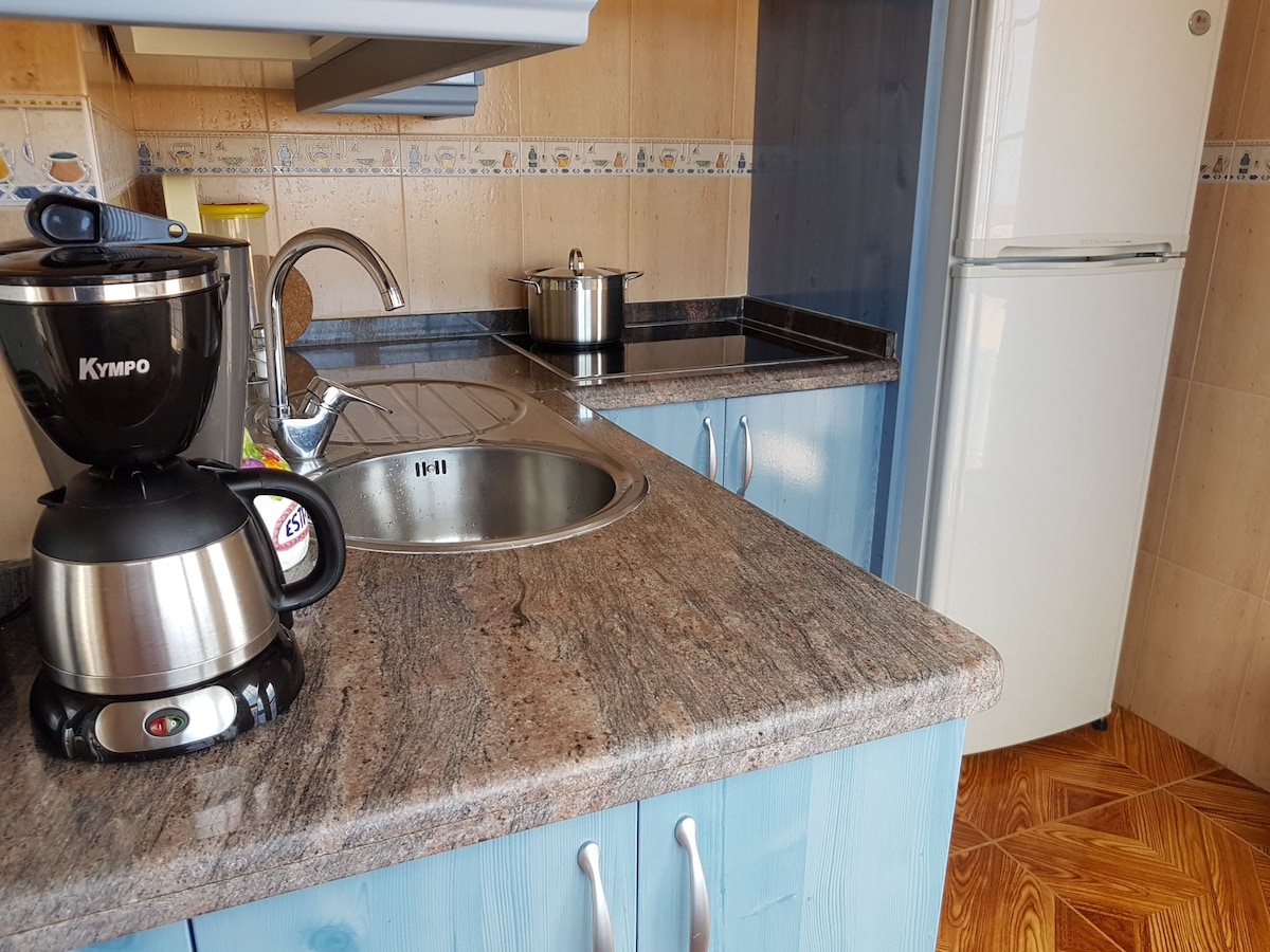 *改装済み* お客様の楽しみ、リラックス、快適さのために設計されています。特別な空間でユニークな環境をお楽しみください。 - 最大4名様(ベビーを含む)までご利用いただけます。WIFI + SAT TV(全言語)。ガレージとエアコン(別途料金)。設備が整っています。細心の注意を払ってください。 - 快適なベッドを備えたお部屋。広々としたリビングとキッチンから、35平方メートルの広々とした日当たりの良いテラス(芝生貼り)に面しています。崖、港、島々の前例のない眺め。