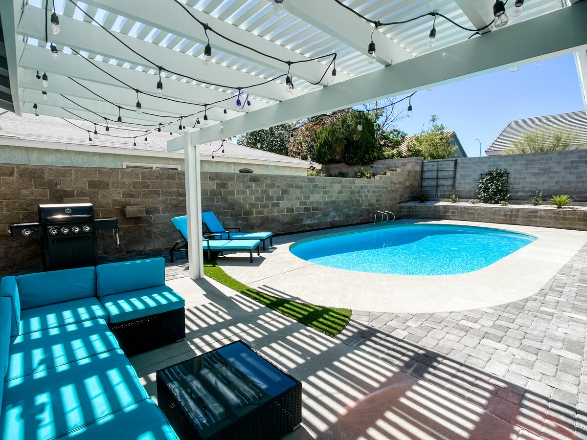 ラスベガスにある1エーカーの砂漠のオアシスに逃避しましょう!私たちの家は、居心地の良さと興奮の独特なブレンドを提供し、バルコニーからは素晴らしい山の景色と活気あるラスベガス・ストリップを垣間見ることができます。最大4名様まで宿泊可能な1200平方フィートのリビングスペース、22フィートのプール、4フィートの深さ、スライド、ピックルボール、バスケットボール。裏庭にある短いパー3ゴルフコースをお楽しみください。賑やかなストリップから車ですぐのところにある砂漠の風景の魅力を体験してください。この砂漠の楽園で冒険が待っています