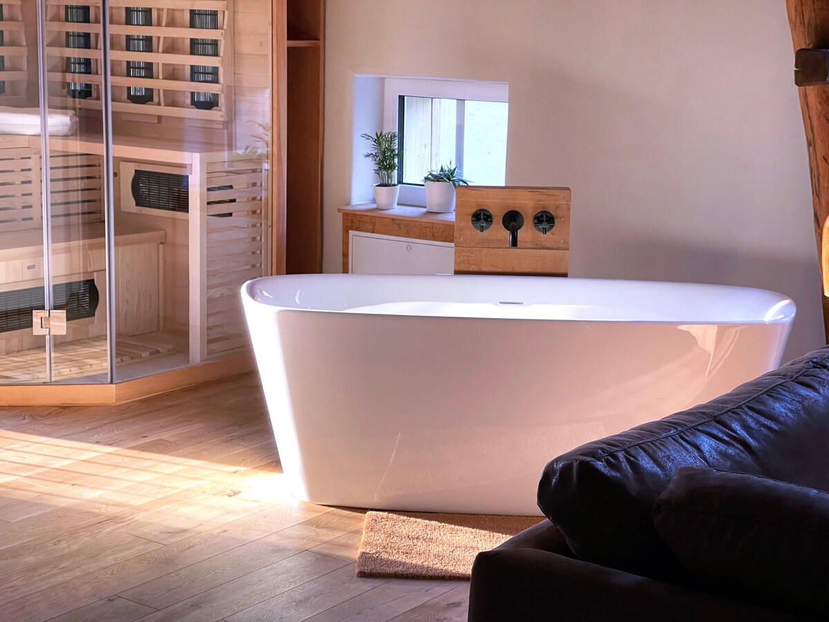 「干し草倉」は、120㎡の広々としたリビングスペースで、ウェルネスエリアで贅沢なひとときをお過ごしいただけます。サウナの後、音楽を聴きながらお風呂でリラックスすることができます。フィットネス愛好家には、WaterRower ower ローイングマシンがあります。マルチメディアエンターテイメントは、高品質のOLEDテレビとレコードプレーヤー、レコードコレクションで提供されています。心のこもったディテールが、発見されるのを待っています。村の小川のすぐそばにある私たちの家で、ゆっくりとくつろぐことができます。