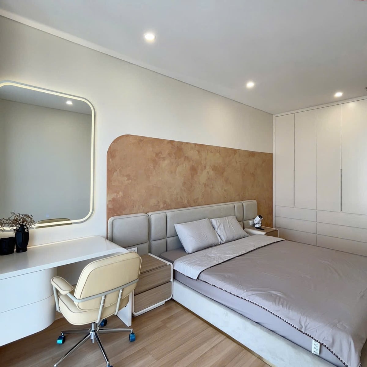 Căn hộ khép kín với phong cách wabisabi với đủ công năng từ điều hoà, tivi, máy giặt, lò vi sóng... đủ đáp ứng nhu cầu sinh hoạt cho khách hàng lưu trú ngắn ngày và dài ngày. Phòng ngủ với cửa khoá riêng, tuyệt đối riêng tư và yên tĩnh. Đệm cao su non dày 20cm, êm ái và thoải mái. Phòng khách với sofa bọc nhung, mịn màng, tivi màn hình phẳng cỡ lớn đã kết nối các tài khoản netflix... Phòng bếp được trang bị đầy đủ: Bàn ăn, bếp từ đôi, lò vi sóng, máy rửa bát, nồi lẩu, bát đũa, xoong nồi...