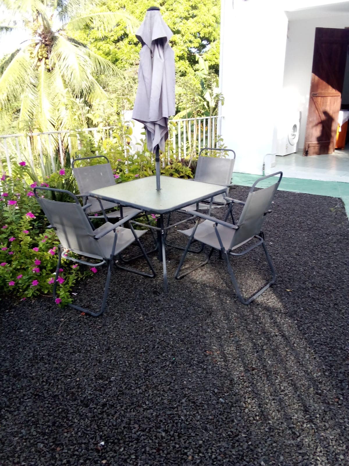 La terrasse fait sortir un avocatier du deck...ombrage naturel... le bruit de la mer comme fond, quartier calme, ambiance tropical mais tout prêt d'une plage, à pieds 1 minute et demi. Bungalow sur pilotis, dans jardin fleuri. Chambre climatisée, petit salon avec un canapé, TV cablé, tout confort pour cuisiner, grille pain, micro onde. Avec le chauffe eau solaire, si pendant 2 ou 3 jours il n'y a pas du tout de soleil, l'eau sera tiède, c'est rare quand même!