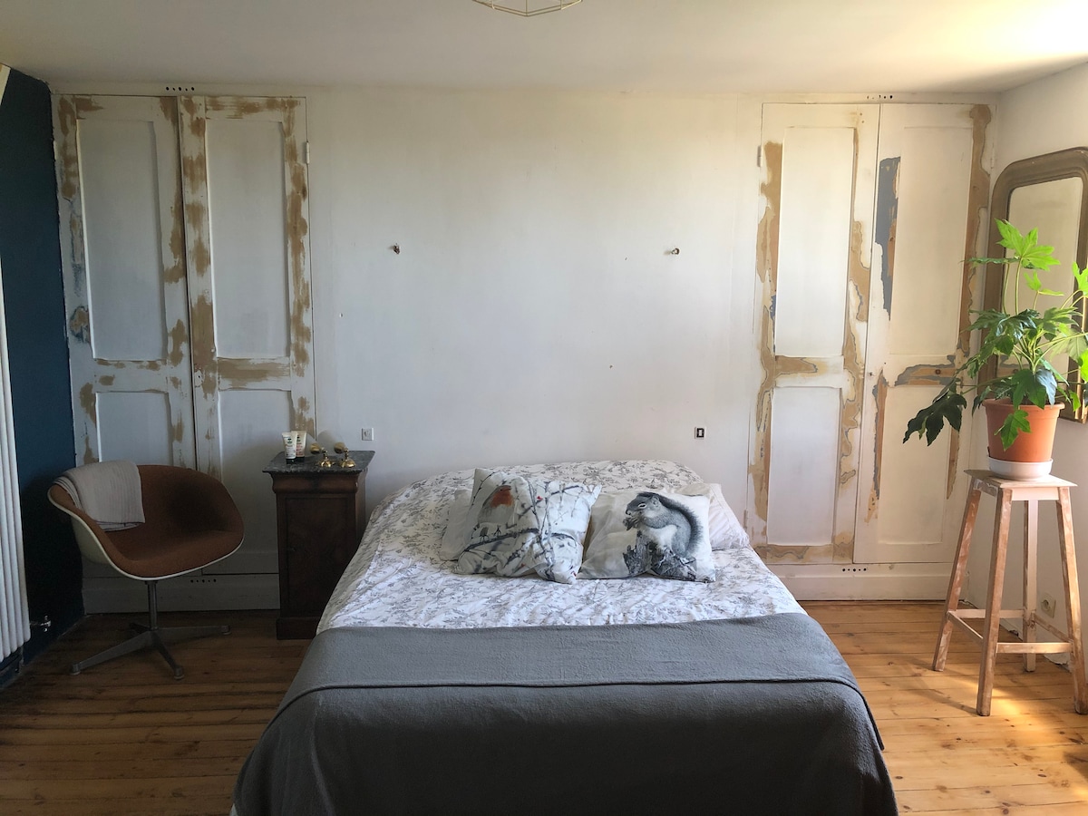 部屋は独立した建物(19世紀の旧シードル工場)にあります。オンフルールから15分、ドーヴィル/トルーヴィルから15分。商店街まで2分(コルメイユ)。出発地点からいくつかのハイキングコースがあります。部屋は広々としており、大きなダブルベッド、専用バスルームとトイレ、ラウンジエリアが備わっています。共用キッチンが利用可能です。このサービスには朝食は含まれていません