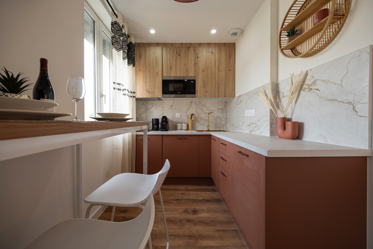 🌍 Bienvenue dans 305 Chanzy Ethnique Chic, un studio haut de gamme pour 2 personnes, situé dans un immeuble entièrement rénové en 2025, conçu spécialement pour Airbnb. Son ambiance ethnique chic, inspirée de la savane africaine, mêle tons rouge profond et couleurs terre, matières naturelles et atmosphère chaleureuse 🌍