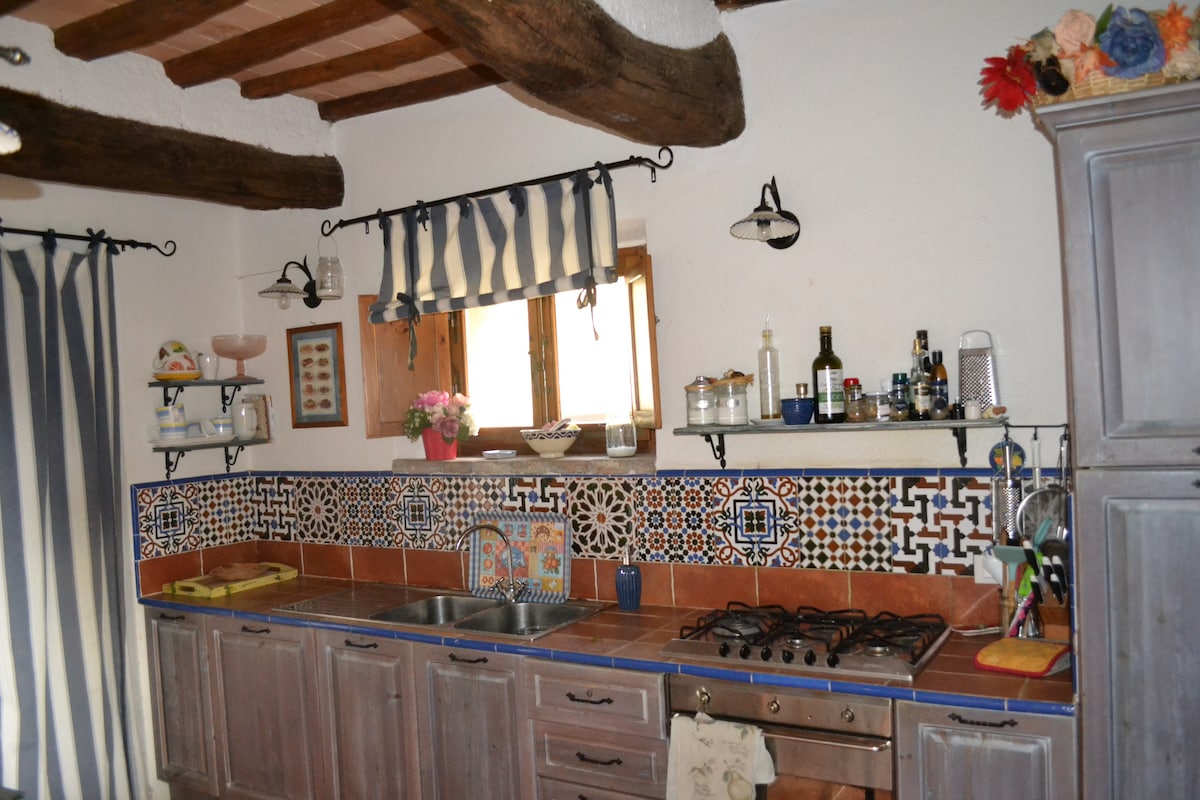 Spend a holiday in the heart of the Tuscan countryside in this cozy stone house with terracotta floors and beamed ceilings in solid oak, furnished with paintings of author , equipped with all comforts. Enjoy yourself by swimming in the large infinity pool (18m X 9m, open from May 1st to October 15th for guests of Stone house use only) or relax in an armchair under the loggia, tasting a glass of Chianti wine in front of the rolling hills of vineyards, olive groves, woods and medieval villages.