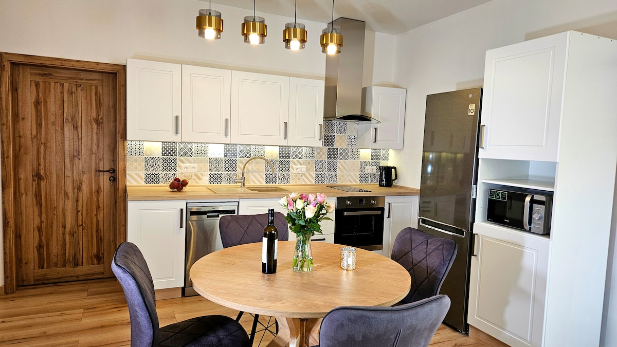 Nově vybudovaný apartmán 2+kk v klidné části města s terasou, wifi, parkováním a uzamykatelnou kolárnou. Ubytování se nachází pouze 20 minut chůze do centra města. Maximální kapacita 4 osoby. V přízemí apartmánu je vybavená kuchyň s ledničkou, indukční varnou deskou, kávovarem a myčkou. V patře se nachází obývací pokoj s rozkládací pohovkou a ložnice s manželskou postelí se vstupem na terasu. V blízkosti apartmánu je cyklostezka (60m), supermarket (300m), koupaliště (350m) a nádraží (700m).