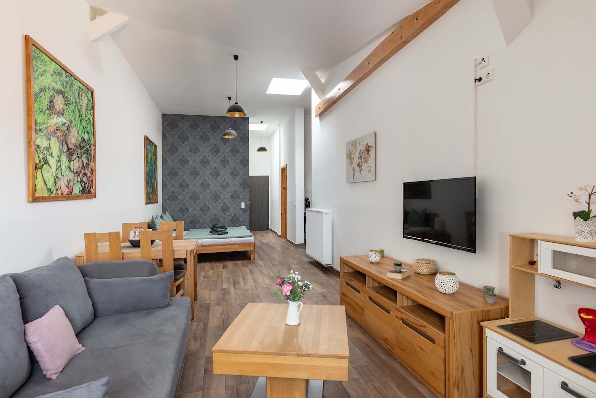この新築のホリデーフラットには2部屋あります(キングサイズベッド1台付きの寝室1部屋と、スタジオソファー(2名以上で寝られる)付きのリビングルーム)。パティオと暖房付きの床があり、家具が完備されています。専用サウナもあります。 徒歩数分以内にショッピングや公共交通機関が利用できます。アパートの正面に無料駐車場があります。市内中心部まで車で約15分です。ライプツィヒでの滞在をお楽しみください。 それでは、お早めのお越しをお待ちしております。