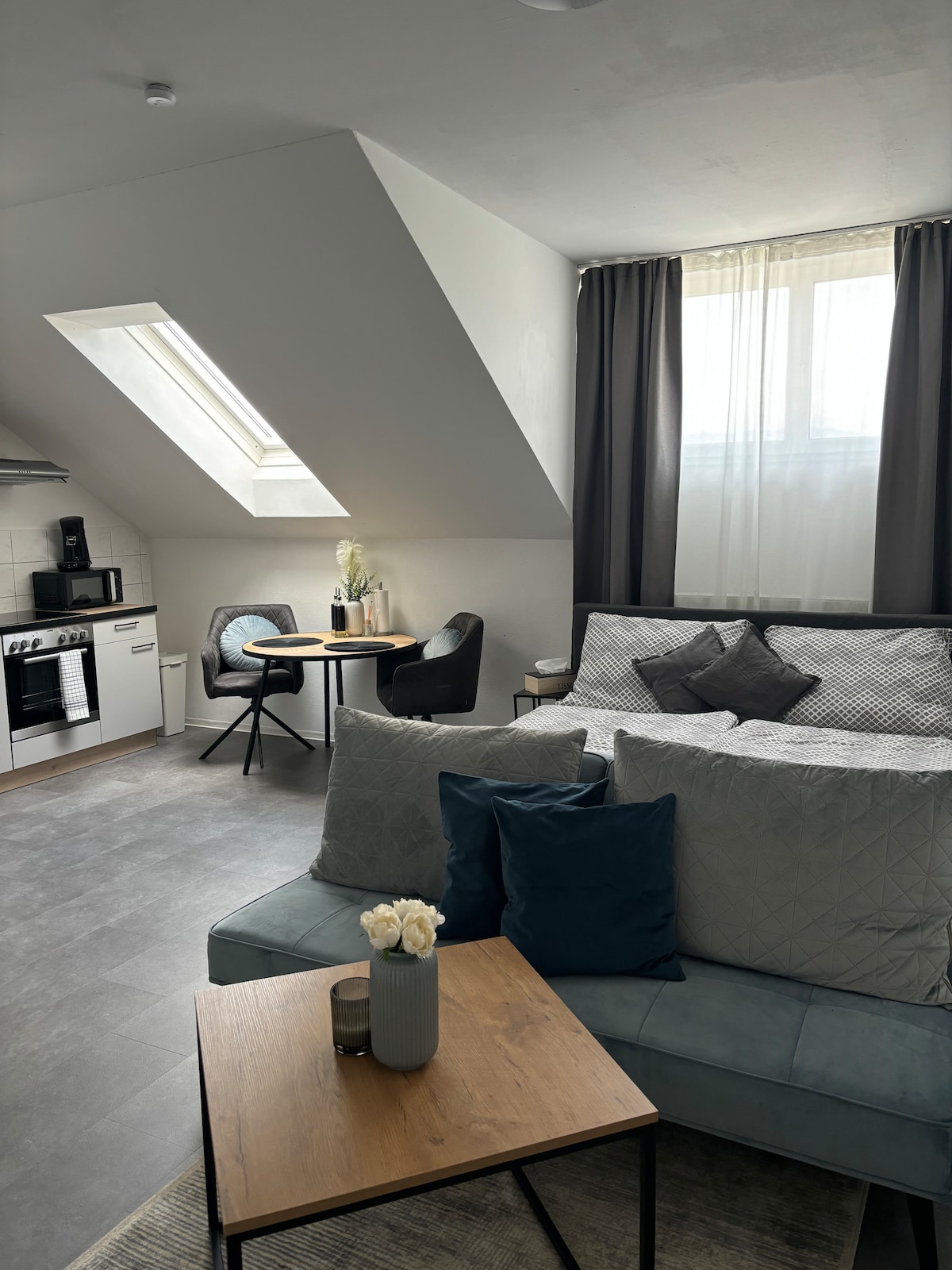 Willkommen in unserer gemütlichen Wohnung! Hier vereint sich Wohnzimmer, Küche und Essbereich zu einem einladenden Raum. Die gut ausgestattete Küche lädt zum Kochen ein. Im Wohnzimmer kannst du entspannen. Das Schlafzimmer bietet ein bequemes Bett, und das moderne Bad sorgt für Erfrischung. Ein kleiner Esstisch rundet den Raum ab. Entdecke Komfort und Gemütlichkeit!
