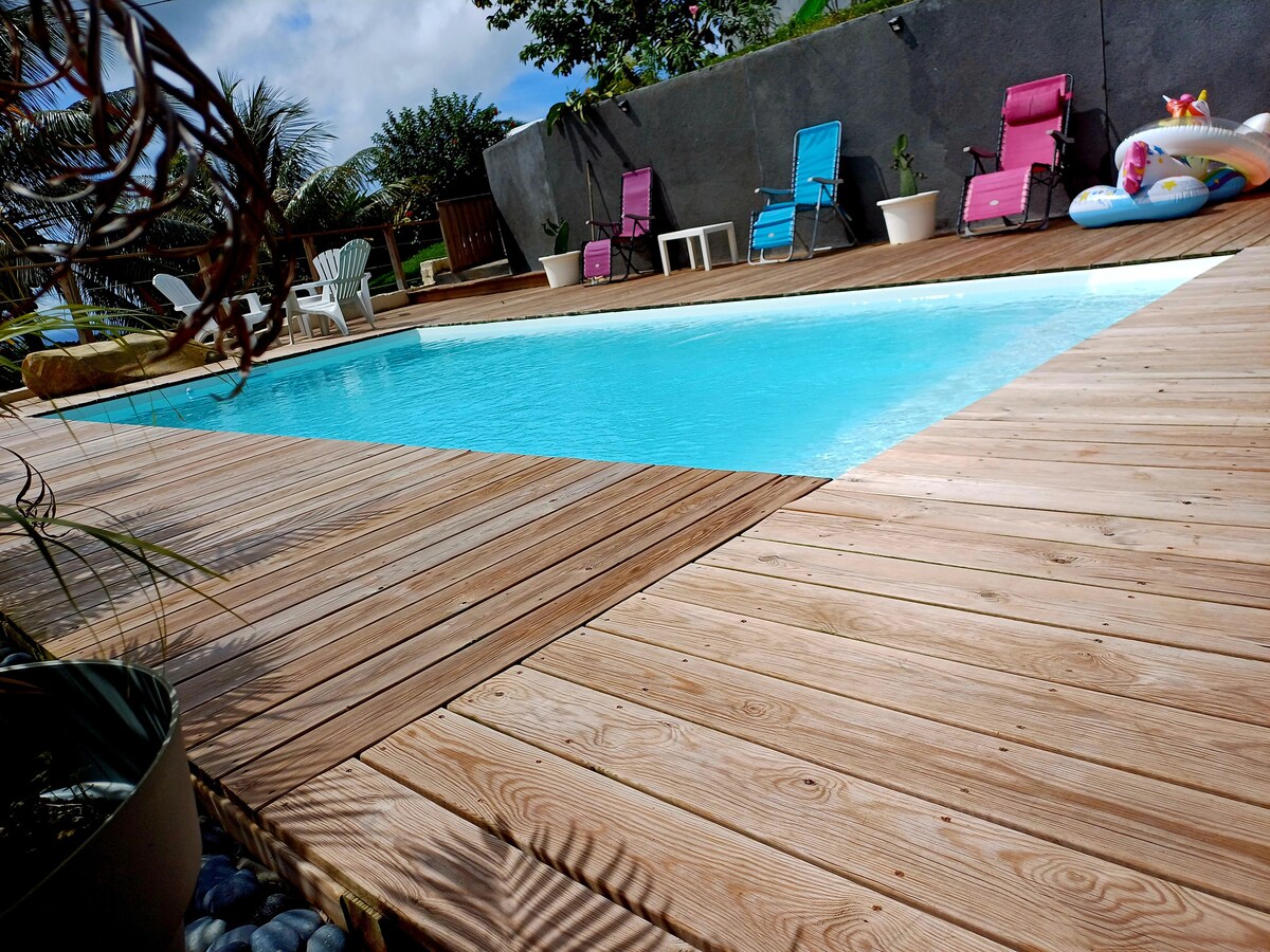 🌴 サント・ルースの高台にある季節限定の宿泊施設。ビーチや商店街まで5分。ロシェ・デュ・ディアマンへの素晴らしい180度の海の眺望。 収容人数:大人4名+子供1名。設備の整ったキッチン、支柱付きテラス。 エアコン完備の寝室2室(バスルーム付き) 専用スパ、緑地。ご要望に応じてレンタカーをご用意いたします。
