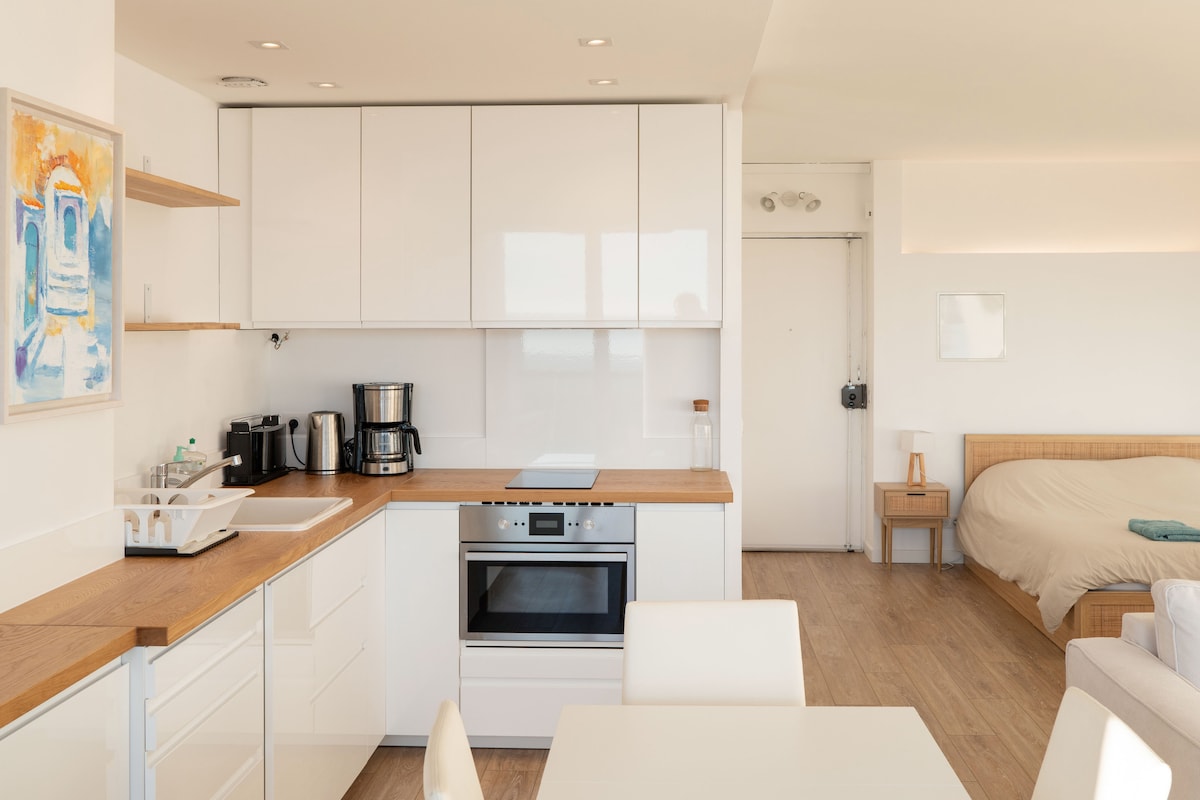 Perched high above the ground floor and overlooking the bay of Marseille, this sophisticated and cozy 1 bedroom studio apartment in the center of the city provides the perfect blend of urban convenience and natural beauty. As Marseille apartments go, this generous, air-conditioned space is at the summit of Airbnb options in the region, offering all-day sunlight and endless sea and mountain views.