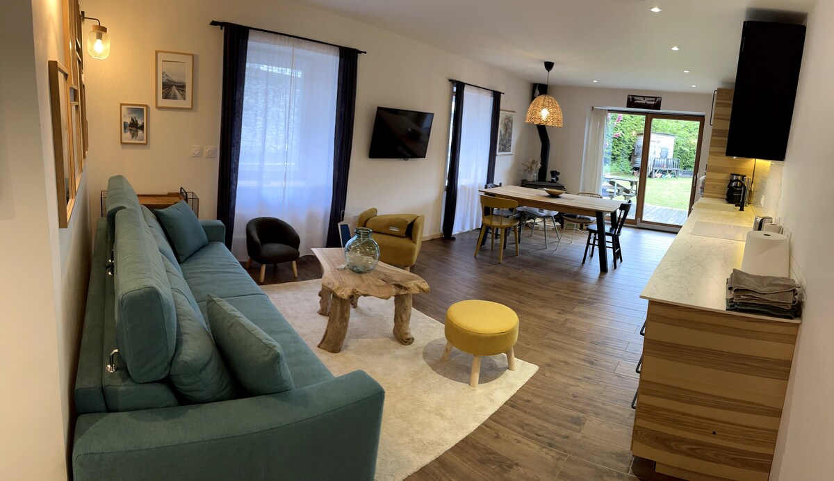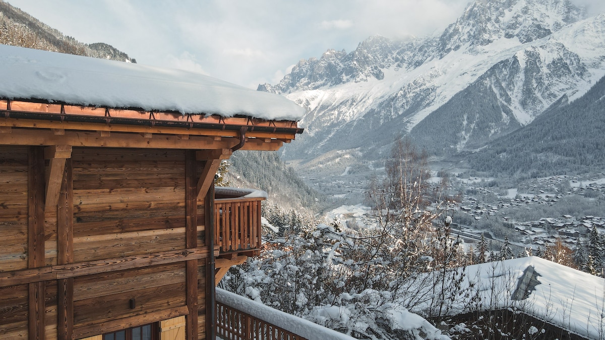 一軒家のシャレーの1階にある68㎡のモダンなアパートで、静かな立地で最大6人まで宿泊できます。設備の整ったキッチン、オープンプランのリビング/ダイニングエリア、スマートテレビ、光ファイバーインターネット、2つのバスルーム(1つはスイートルーム)があります。 東向きの広々とした玄関からは、エギユ・デュ・ミディやレ・ドルスなど、モンブラン山塊の素晴らしい景色を眺めることができます。外には、テーブルと椅子のある小さな専用デッキがあり、フェンスのない庭に面しています。