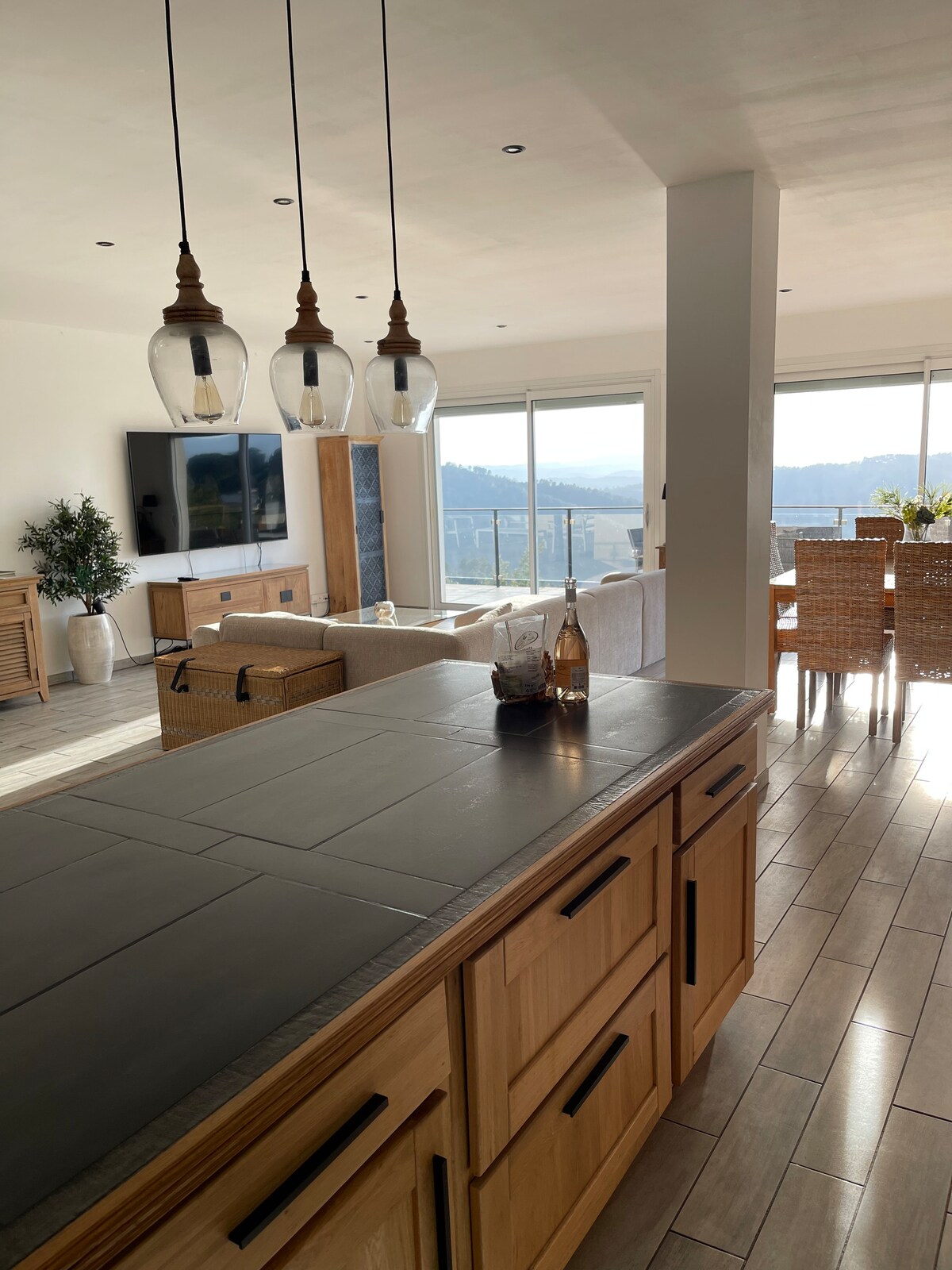 5 storey luxury 175m2 16th Century townhouse in the heart of medieval Saint Paul de Vence, stunningly renovated with a seamless blend of historic authenticity and luxurious Provençal modernity, and situated overlooking the ramparts giving breathtaking panoramic views of the sea and the mountains. The 3 generously proportioned air-conditioned suites (each 35m2) with en-suite bathrooms sleep 6 guests, and the house has a beautiful open plan fully-equipped kitchen/dining room.