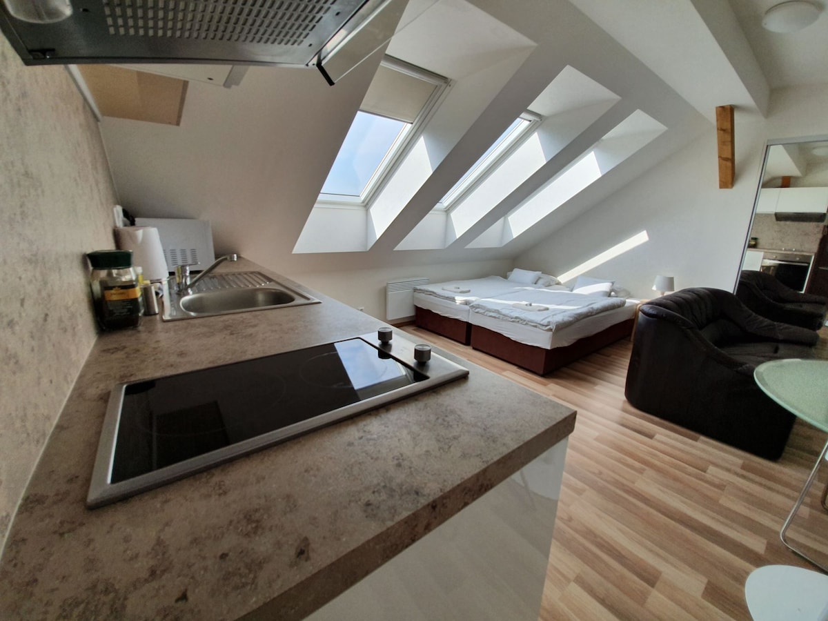 屋根裏にある新しいエアコン付きアパートメントには、2台のシングルベッドがあります。ダブルベッドとしてもご利用いただけます。 設備の整ったキッチン、シャワー、洗濯機、ヘアドライヤー、アイロン付きのバスルームが含まれています。アパート全体が高速Wi-Fiでカバーされています。薄型テレビがあります。近くにはレストランSvatoboj、食料品店、美しい自然に囲まれた人気の自転車道、そしてブルノの最高のウェルネスセンターの1つである4comfortがあります。