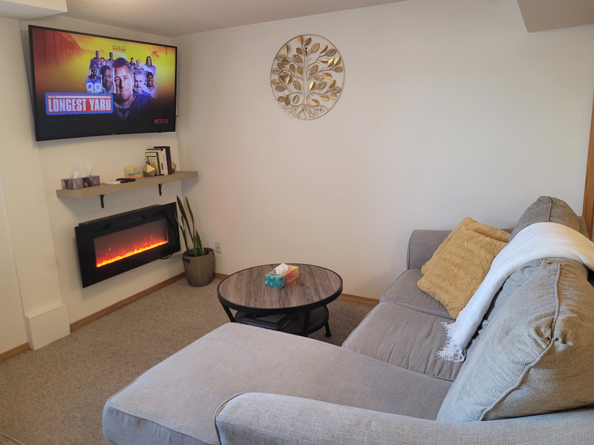 これは約2000平方フィートの広々としたリビングスペースです。 ガレージへの共用玄関があります。 レンタルは階下のみで、専用ドアがあります。 この地下スイートには大きな窓と広々としたお部屋、そしてキッチンがあります。 薪ストーブがあり、快適な田舎の雰囲気を味わえます。 こちらはリラックスした雰囲気の新しい家で、DVDプレーヤー付き60インチスマートテレビ、スチームシャワー、ビリヤードテーブルがあります。 干し草原に囲まれたとても静かなエリアで、焚き火台と座席エリアがあります。