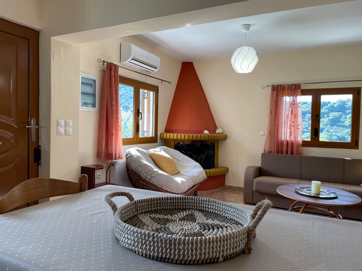 私たちのアパートは、エヴィア島のアギオイ・アポストロイにある静かで居心地の良い1階の家です。82平方メートルの広さで、暖炉、暖房、エアコンを完備しています。ダブルベッドルーム2部屋、設備の整ったキッチン、ソファベッドとベビーベッド(リクエストに応じて)を備えた広々としたリビングルーム、バスルーム1部屋があり、5〜6名のゲストを収容できます。大きなお庭と専用駐車場があります。海や村の中心部から車でわずか2分。一年中リラックスするのに理想的です!