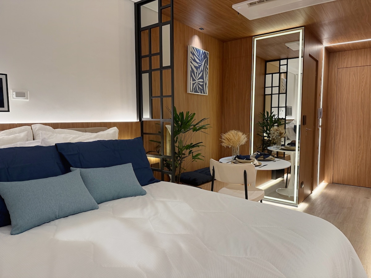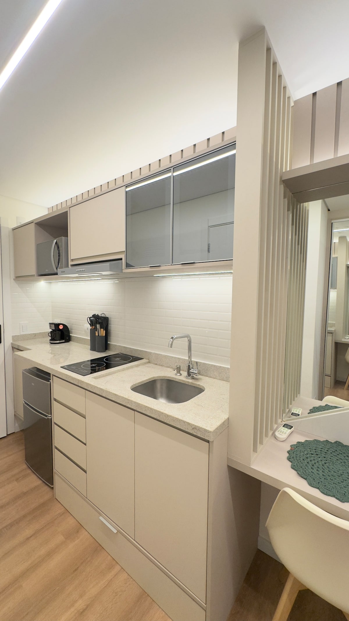 Batel em clima clean. Studio completo no Lifespace Curitiba, em frente ao Shopping Curitiba (do outro lado da avenida), com cama padrão hotelaria, sofá cama e cozinha integrada. Acomoda até 4 hóspedes com folga real. Piscina aquecida coberta, academia, sauna, sala de jogos, lavanderia coletiva e mercadinho no próprio prédio. Garagem inclusa na diária. Fechadura digital para check in sem atrito. Ideal para casais, famílias pequenas e viagens a trabalho.