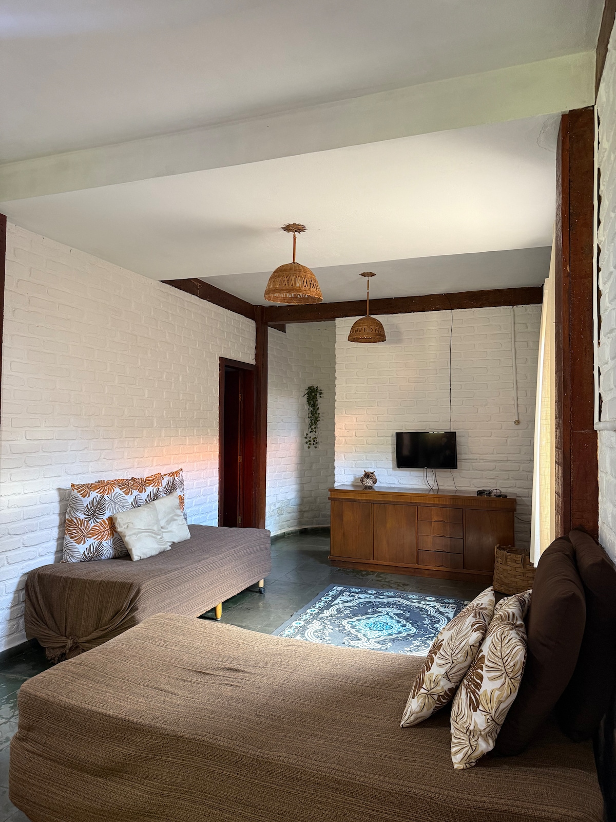 A Suíte Máster é uma acomodação independente no 2º andar da Casa do Edi. Localizada na parte alta da vila, onde é possível apreciar as belas paisagens das montanhas e um incrível visual para o pôr-do-sol. A suíte máster, conta com hidromassagem e linda vista panorâmica para a natureza exuberante que nos rodeia por aqui. Além disso, a fim de proporcionar mais conforto e comodidade, possui lareira para dias frios, sacada com churrasqueira, cozinha compacta e piscina em área de lazer compartilhada.