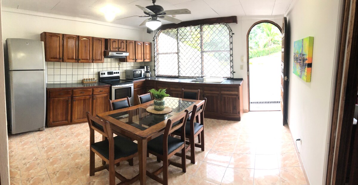 This 80 sqm beautiful 2 bedroom/ 2 bathroom apartment with ocean view with its own parking space is separated from the rest of the buildings on a 1.5 acre property. On the property are 3 more apartments and a main house which is occupied by the owners. The huge lush green tropical garden is a save and tranquil oasis outside of Puerto Limon, 5 min to a small beach, restaurants, Cocori Nature Reserve and 10 min to downtown. This accommodation is ideal for couples, families or small groups.