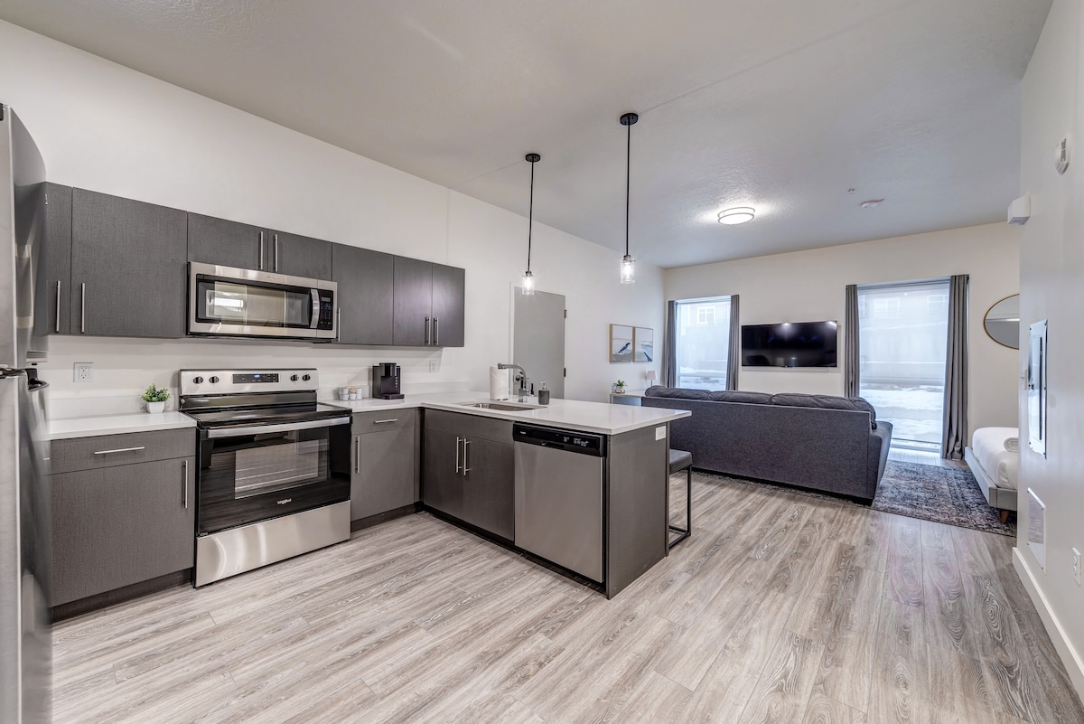 柔らかい枕、快適なソファ、素敵な仕上げの快適なベッドをお楽しみいただけます。キッチンには基本的な調理器具、食器、電子レンジ、コーヒーメーカーがあります。ケーブルテレビ、Apple TV、Netflix、オンデマンドの無料映画が視聴できる60インチテレビがあります。ピックルボールコートとジャグジーがあり、アメリカンフォークキャニオンから10分、I -15から15分、交通量が少ない場合はソルトレイクのダウンタウンから約35分です。お店や美しいアウトドアに近いです。宿泊は合計6名様までとなります。例外はありません。