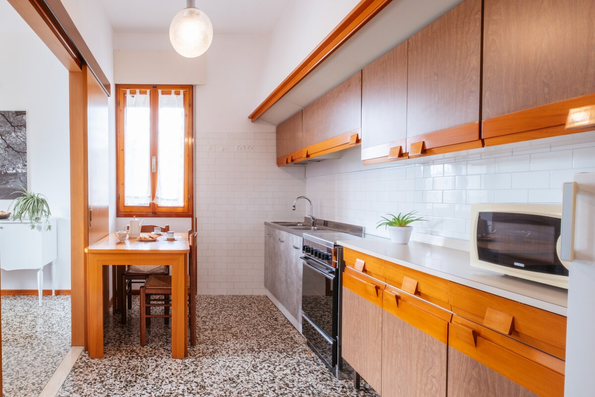 The apartment on the upper floor of a country house has air conditioning and heating. It is located near the beach and the Venice lagoon. There are three large bedrooms with the option to add an extra bed or a crib, a fully equipped kitchen, a living room, a dining room, a bathroom, and a terrace. Outside, there is a fenced parking area for multiple cars, a barbecue, a microwave, free Wi-Fi, and bicycles available.
