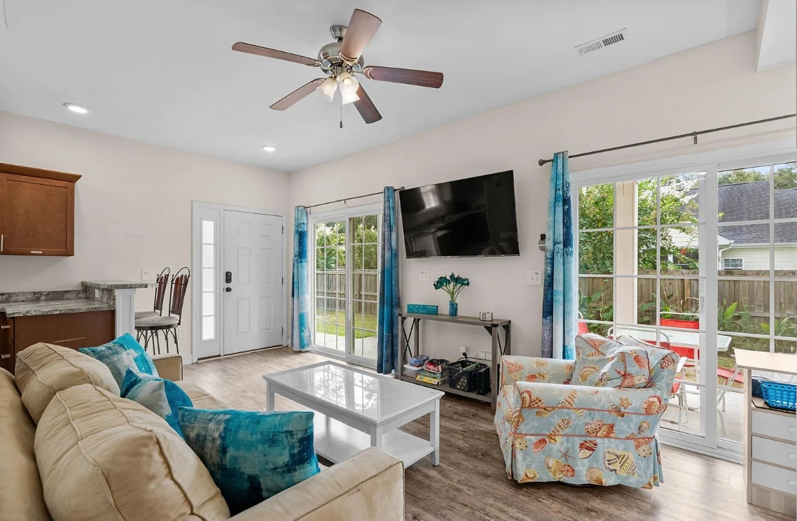 Quiet Inlet area steps away from bike path leading to Marshwalk & Marina. No stairs! private backyard patio with pet gate attached! Two bedrooms one bath all to yourself. King size bed! Free parking. Reclining leather sofa! Across the street from Tidelands’s Waccamaw Hospital. No need to drive! Walking distance to grocery, shopping, churches, entertainment, and most any amenity you may desire. Dunkin is across the field for breakfast! Bicycles available with booking! “Off the Hook!”