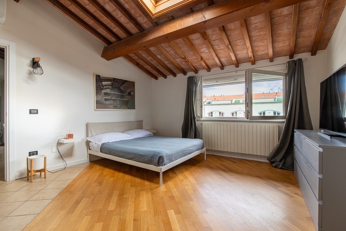 An old tower house in the heart of Pisa. A fully equipped stainless steel kitchen with espresso machine and kettle. The interiors blends wooden beams, steel and glass with a swinging hammock, designer lamps, a turntable and an extensive library of art and illustration books. The bedroom is accessed via an internal staircase, while the apartment is located in the attic (3rd floor) of a historic building: the staircase is a bit steep, so unfortunately it may not be comfortable for everyone.