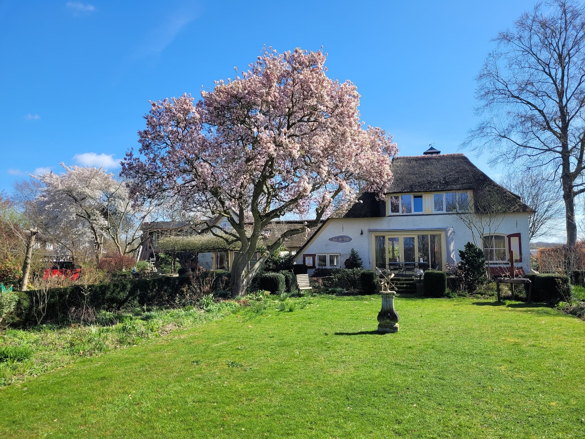 Dit voormalige boerderijtje hebben we uitgebouwd tot een fijn woonhuis. We hebben een grote tuin van 5000 m2 met aan de voorkant een heerlijke overdekte nis om droog buiten te zitten en aan de achterzijde een hoog terras met uitzicht op weidse tuin en grote zwemvijver. Achter de heg is er een een houtgestookte 'barrel'-sauna . Ook is er een boomgaard met peren, pruimen en appels en walnoten...een geheim pad naar een chalet achter in de tuin en overal een prachtig uitzicht over de IJssel.