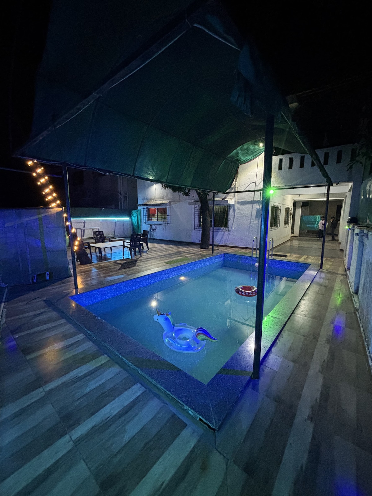 •3 AC bedrooms with washroom •Kitchen with Induction, Purifier and fridge •35*12fts GIGANTIC swimming pool •4 seater outdoor jacuzzi(Rs.2000 chargable) •1000 sqfts of outdoor area. •Private parking space for upto 6 cars •800 sqft of huge Living room with TV,Bluetooth system •Amazing view from terrace •Barbeque Rs.500 •The property has solar geyser. In rains, we have a water heater which requires around 2 hours to get the water hot. .Wifi available on ground floor only.