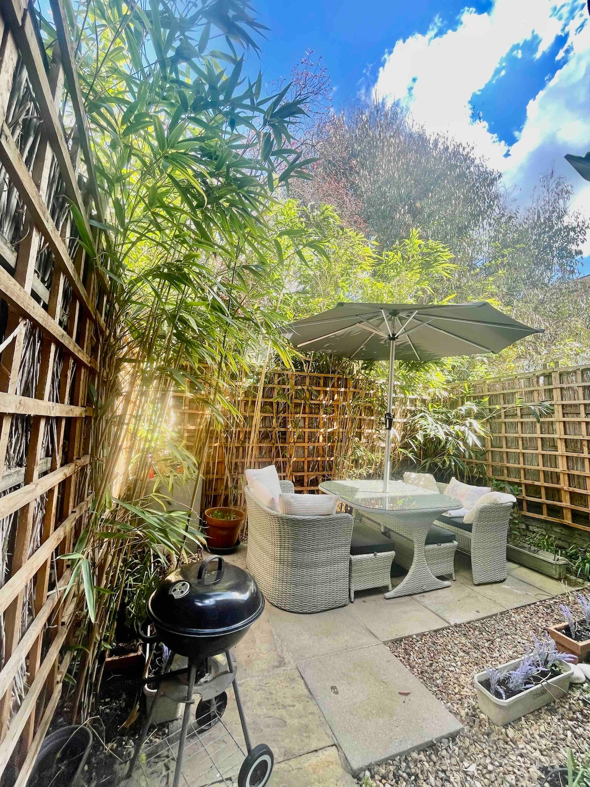 歴史あるハイゲートビレッジの中心部に位置する、美しい自炊式ガーデンスタジオ。 320平方フィートのワンルームには、キングサイズベッド、簡易キッチン、広々としたシャワー付きバスルーム、55インチの高画質テレビ、BBC iPlayer、Amazon、Netflixが備わっています。 座席付きの半プライベートな屋外パティオがあります。 ハムステッドヒースとハイゲート墓地に沿って、徒歩数分以内に10軒のパブやレストランがあります。 近くにはバスや地下鉄の便利な交通機関があります。