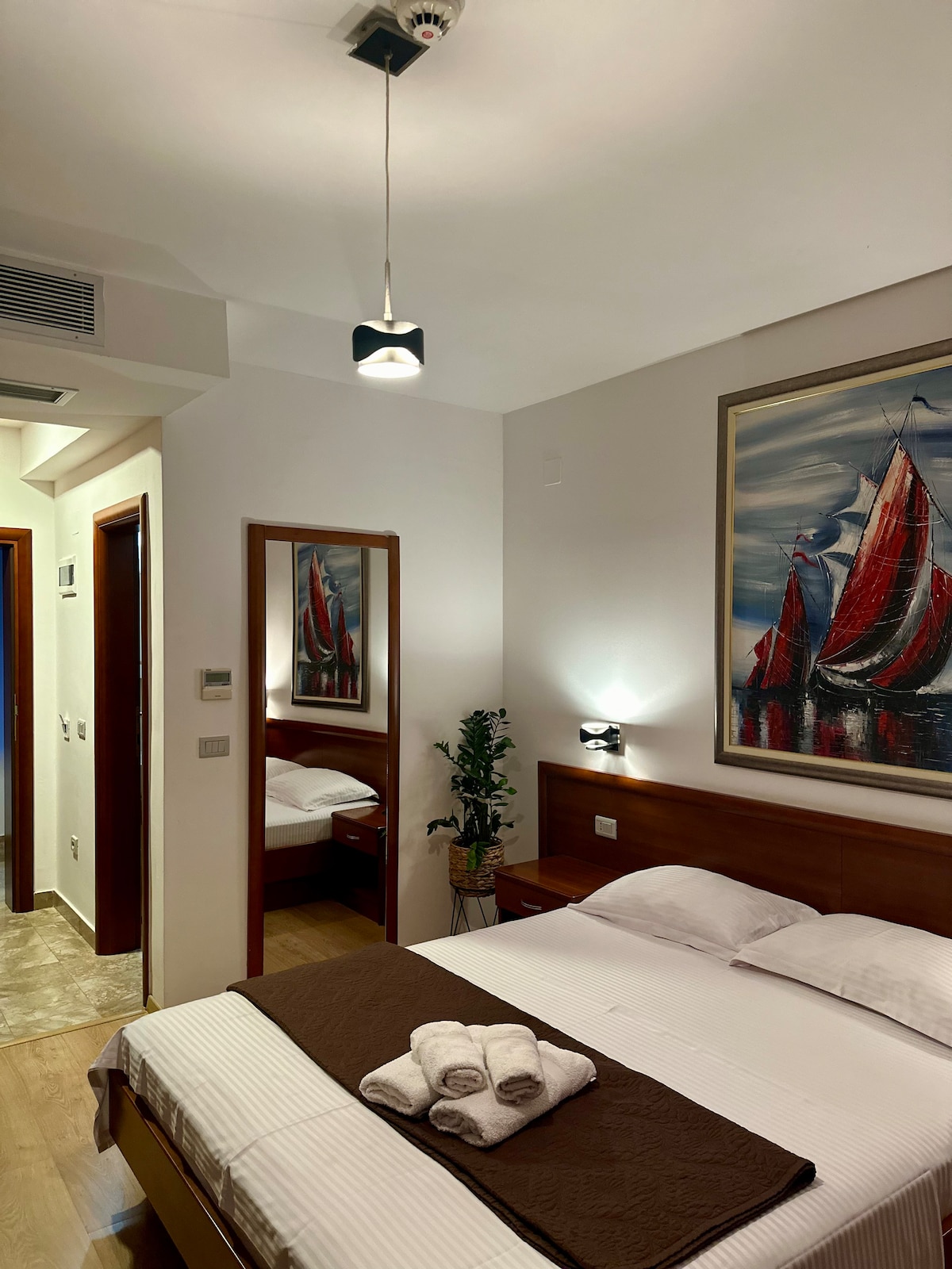 60平方メートルの広さを誇るデラックスダブルアパートメントには、リビングルームとベッドルームがあり、ダブルベッド(170×200cm)1台と、別々に置かれたシングルベッド(90×200cm)2台が備えられています。このうち、2台のベッドはご要望に応じて組み合わせることができます。 このアパートには、小さなビーチと旧市街の美しい景色が楽しめるバルコニーが2つあります。 エレガントでモダンなデザインが魅力的な、快適で贅沢なアパートでお楽しみいただけます。