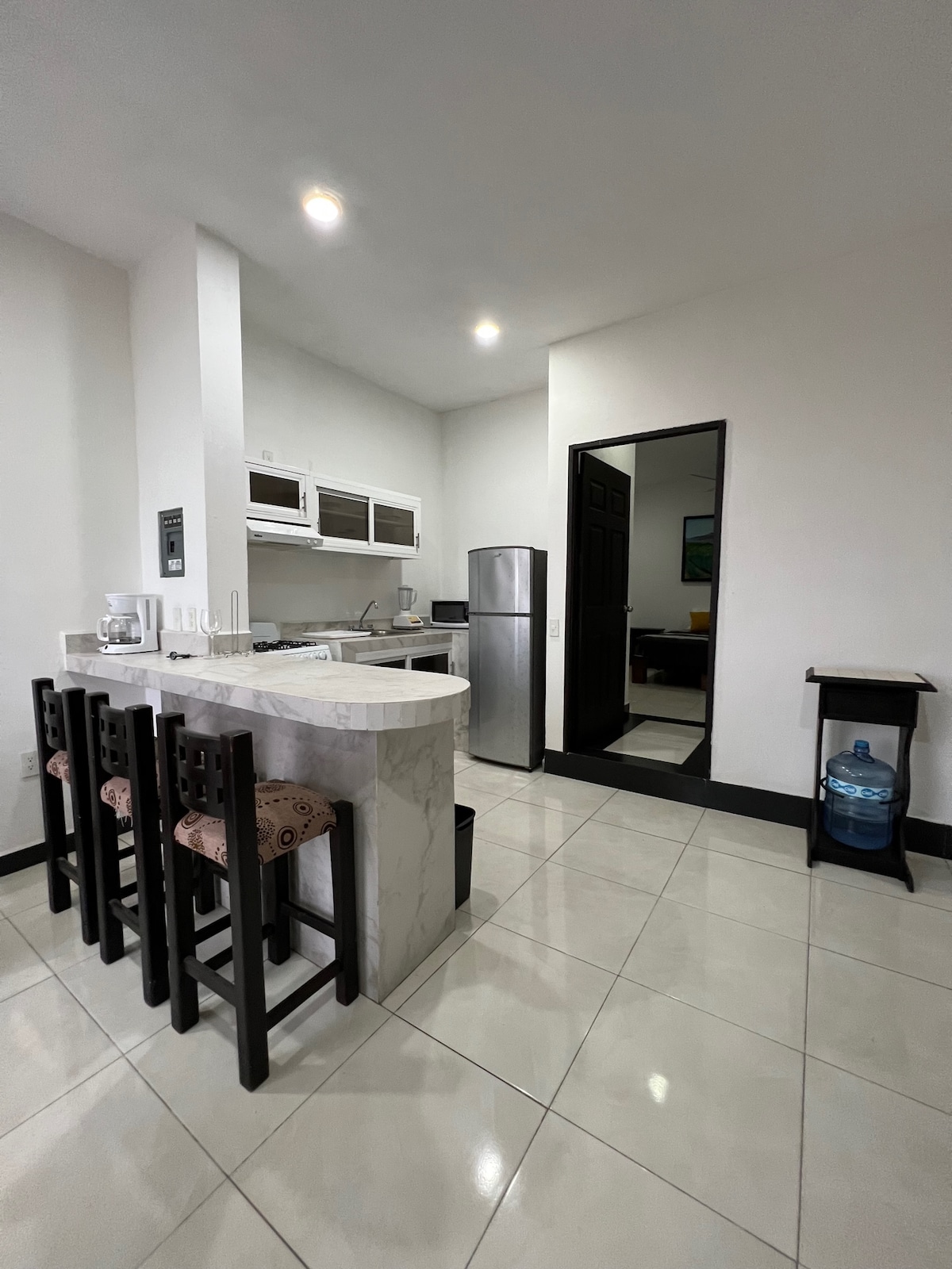 SUITES FLAMINGOSの1階にある素朴なメキシコ様式の1ベッドルームスイート。リビングルーム、キッチン、ダイニングルーム、Wi-Fi、ケーブルテレビ、エアコン。庭園の景色と静かな共用プールエリアをお楽しみください。このコンドミニアムは細心の注意を払って管理されており、快適な滞在に必要なものがすべて揃っています!ビーチ、チェドラウイスーパー、バス停、マリーナからわずか1ブロック 近くにあります。 一人旅やカップルで静かな時間を過ごしたい方におすすめです。