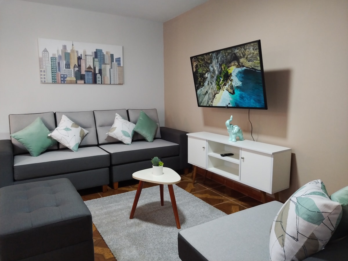 居心地の良い雰囲気へようこそ。お客様とご家族のための静かで快適な場所をお楽しみください。高速光ファイバーインターネットを備えた設備の整ったアパートで、55インチスマートテレビでNetflix、Amazon Primeをお楽しみください。空港から20分、リマ中心部から25分、主要な大通りから50メートル、Megaplaza、Plazanorteなどのショッピングセンターから10分、国内の様々な地域へ向かうバスターミナルから10分です。