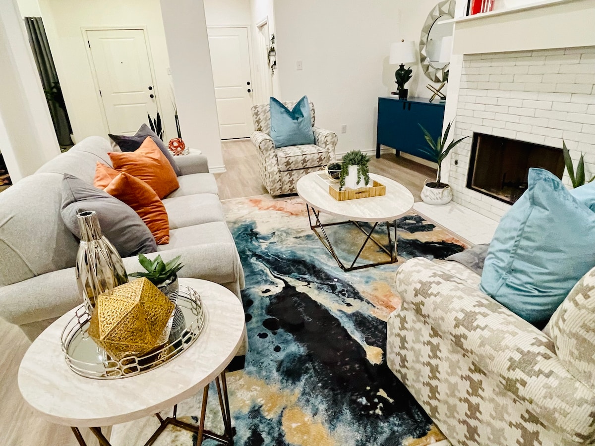 This Boho themed getaway is ideal for families & group stays! Featuring a full kitchen, fast W-Fi, two living areas, and a 65" SmartTV (Complimentary Netflix, Hulu, Amazon). Recently updated throughout the home with a modern & functional atmosphere designed for guests to relax & unwind. Beautiful backyard with large trees, fully fenced grass yard, covered back patio and outdoor games, perfect for entertaining guests. We look forward to hosting your stay!