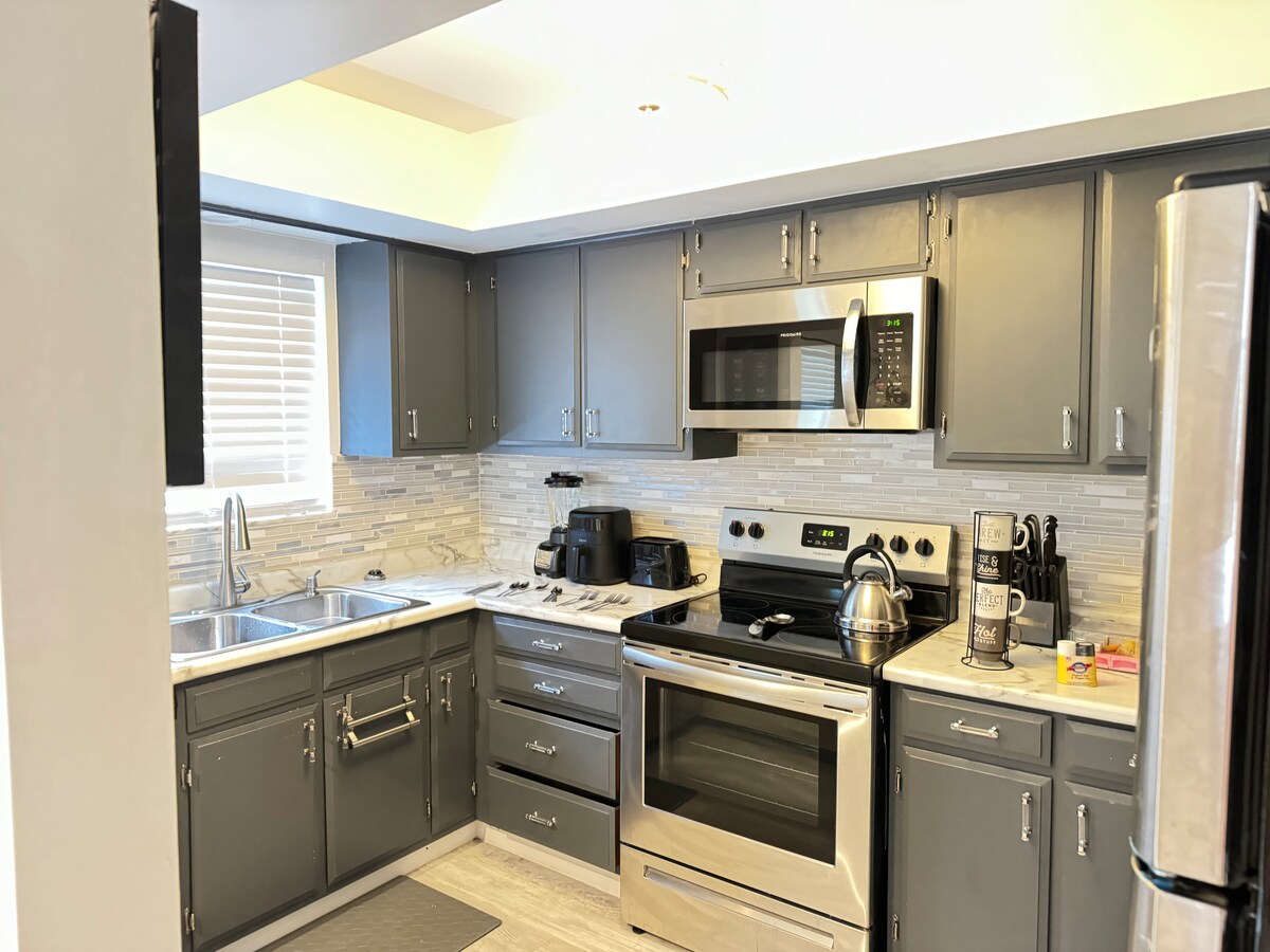 2ベッドルーム、1500平方フィートのユニット。病院から2ブロック、大学から4分の場所にあり、医療従事者や教育従事者に最適です。フルオフィス、ランドリーアクセス、ジムを完備。高速インターネット、65インチLGスマートテレビ、アイロン、アイロン台、ヘアドライヤーが含まれています。簡単な食事の準備やディナーの作成ができるように、ステンレス製のサムスン製家電を備えたフルキッチン。