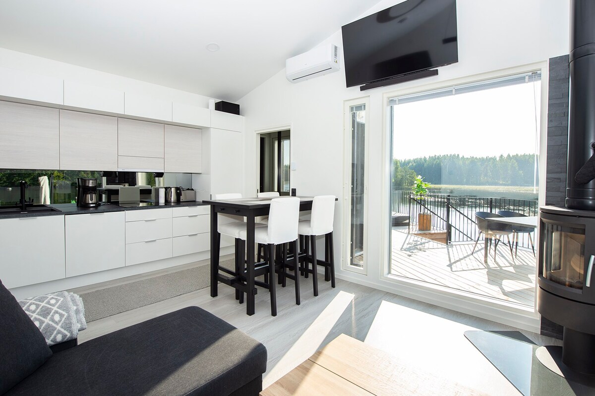 静寂とプライバシーが贅沢に楽しめる宿泊施設 清らかなヴェシヤコ湖畔でリラックスし、自然を満喫しましょう。 このヴィラには、エアコン、食洗機、洗濯機、サウナ、湖水を使ったジャグジー(湖の景色を楽しめます)など、現代的な快適さが備わっています。 テキスタイルやキッチンには、フィンランドの多くのデザイナーブランド(Marimekko、Iittala、Fiskars、Balmuir)の製品が使用されています。 カヌー、SUPボード、電動モーター付き手漕ぎボートをご利用いただけます。ホットタブのご利用は料金に含まれています。 ヘルシンキから車で2時間半未満、ヘルシンキ空港から2時間未満