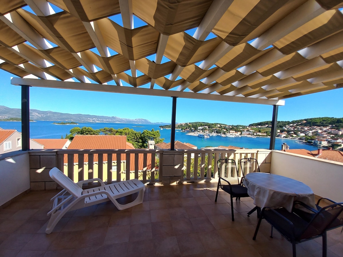 新着!コルチュラ島の眺め コルチュラ旧市街、近くの島々、そして魔法のような星空の素晴らしい景色を楽しめる素晴らしい専用テラスを備えたアパート全体。 コルチュラの旧市街から徒歩10分の場所にある、完全に改装され新しく家具が取り付けられたアパートです。 広々としたアパートは、家族経営の家の2階にあり、完全なプライバシーを確保するための専用玄関があります。