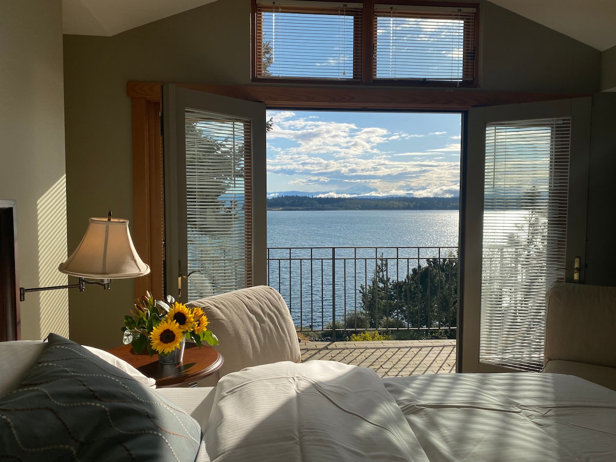 あなただけのプライベートビーチからすぐの場所にある、こののどかなビーチハウスに逃げましょう。 通りすがりのフェリー、ベーカー山、ベリンガム湾、ポーテージ島のパノラマビューをお楽しみください。 多くの曲がりくねった階段を下る旅は気の弱い人には向きませんが、自分だけの楽園にたどり着けば、完全に価値があります。